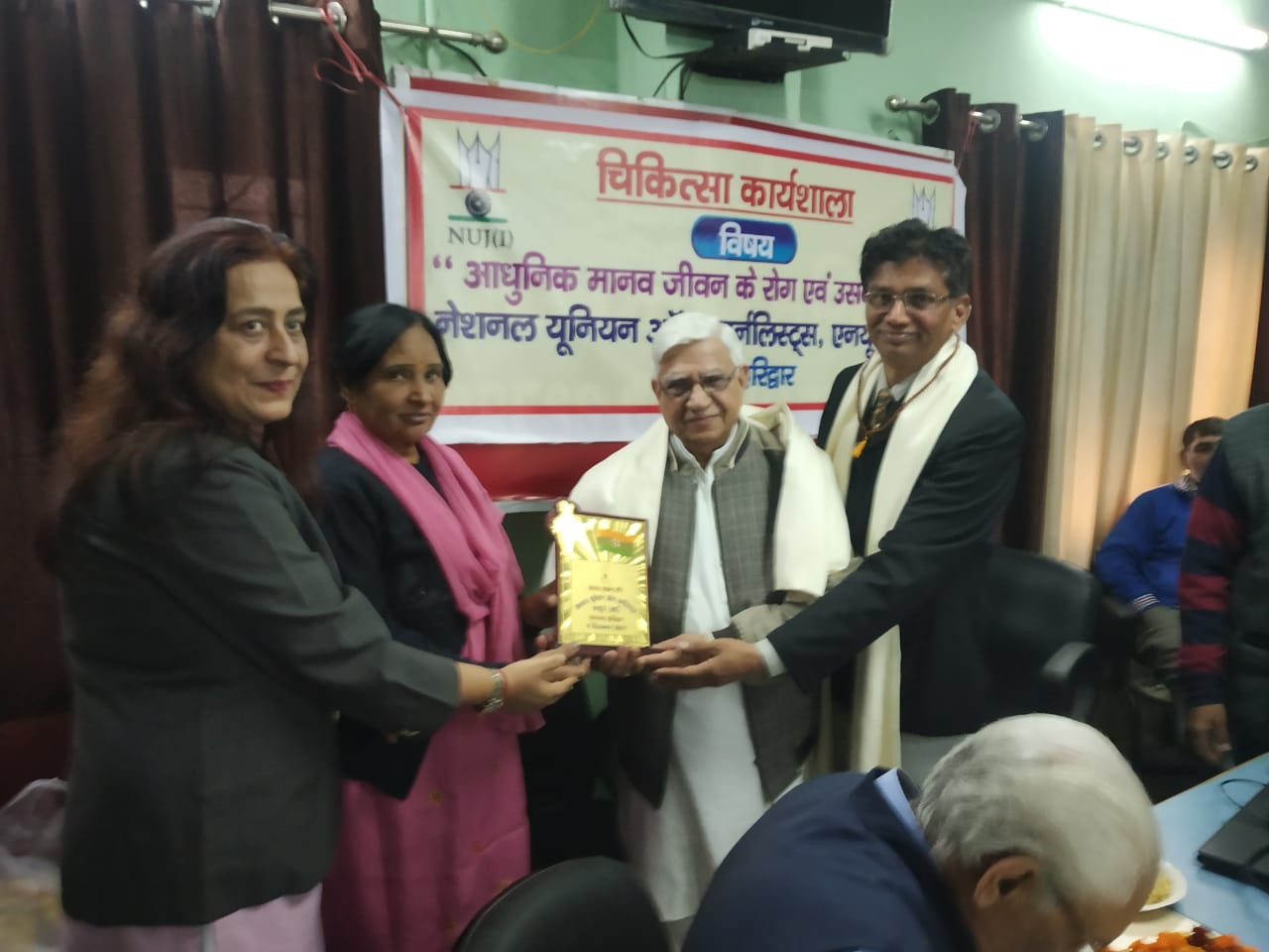 कार्यक्रम में मुख्य अतिथि के रूप में बोलते हुए पतंजलि योगपीठ के संस्थान दिव्य फार्मेसी हरिद्वार के मानव संसाधन विकास विभाग के महाप्रबंधक एनसी शर्मा ने कहा कि आज मनुष्य एलोपैथी पद्धति से चिकित्सा करा कर और उसके दुष्प्रभावों से अत्यधिक पीड़ित है ।इसलिए वह भारतीय प्राचीन ऋषि-मुनियों द्वारा खोजी गई चिकित्सा पद्धति आयुर्वेद और अन्य वैकल्पिक चिकित्सा पद्धतियों का सहारा लेकर राहत महसूस करता है उन्होंने कहा कि प्राचीन भारतीय चिकित्सा पद्धति में अनेक विधाएं विद्यमान है जो आज बेहद प्रचलित हो रही हैं। उन्होंने एनयूजे द्वारा आयोजित चिकित्सा कार्यशाला की प्रशंसा करते हुए कहा कि पत्रकारों द्वारा इस तरह की सामाजिक गतिविधियां संचालित करके समाज सेवा का एक बड़ा कार्य किया जा रहा है। कार्यक्रम संयोजिका डॉ. राधिका नागरथ ने कहा कि लोगों के स्वास्थ्य को देखते हुए वैकल्पिक चिकित्सा पद्धति से होने वाले फायदों के लिए चिकित्सा कार्यशाला का आयोजन किया गया है।
